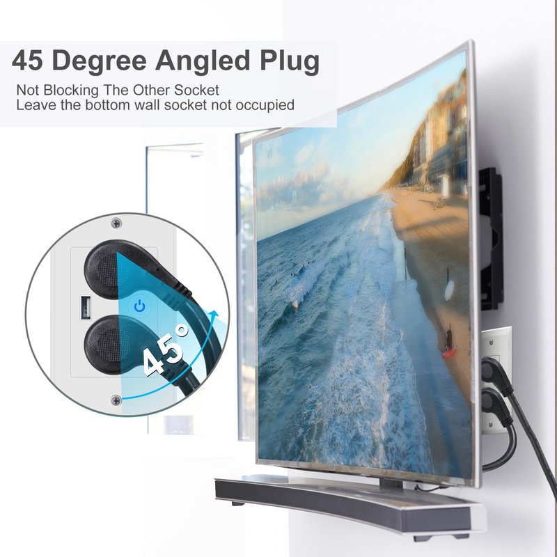 【Low Profile Flat Plug NEMA 5-15P】45-Degree angled flat head plug power cord extension, perfect solution for behind furniture or a desk close to the wall outlet. Right angle 3 Pin AC power cord plug extends only 0.58 inch from the receptacle; Non-blocking design directs the cord to the right of the receptacle, extends the cord to the right to avoid blocking the bottom AC outlet.