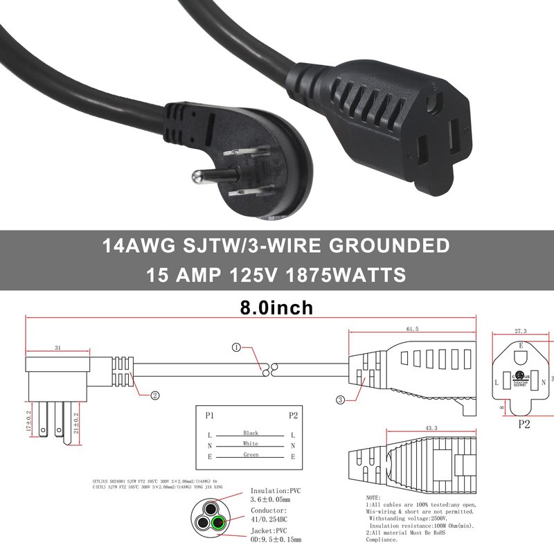 Specifications: Voltage: 110V-125V Max Power Rating: 15A, Max 1875W Toatl Length: 6 Inch Color: Black Cable: SJTW 14/3 Gauge Plug&Outlet: 3Prong Grounded Package list: 1 Pack Extension Cord