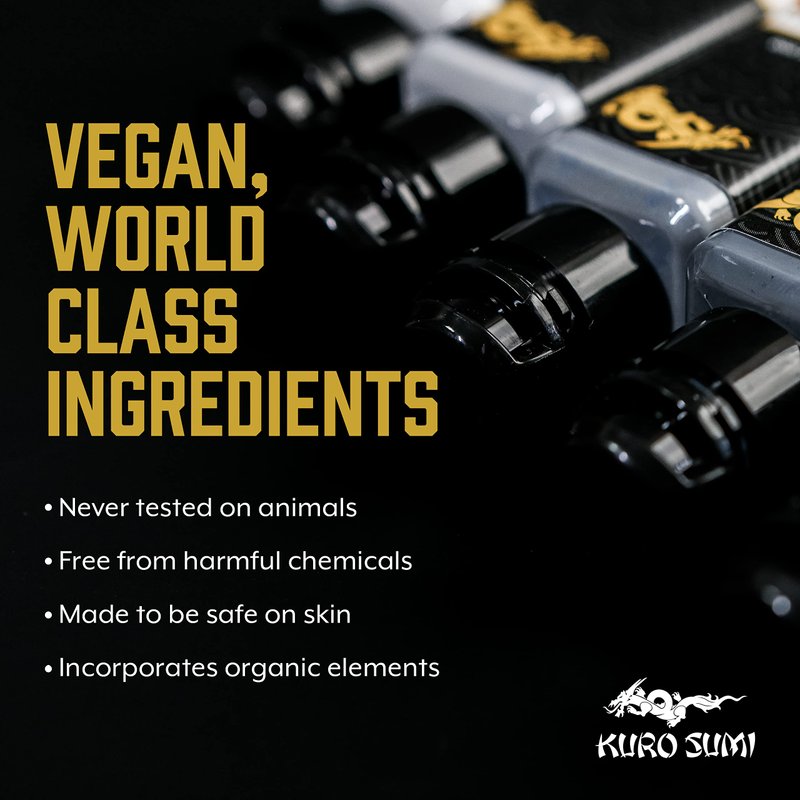 - Give Your Tattoos the Ink They Deserve - From the hills of Japan comes a timeless tattoo ink formula for truly organic ink that will stand the test of time. Made from the best vegan-friendly ingredients and inspired by ancient art, Kuro Sumi tattoo inks come in over 59 ultra-concentrated colors for the superior quality your work deserves.