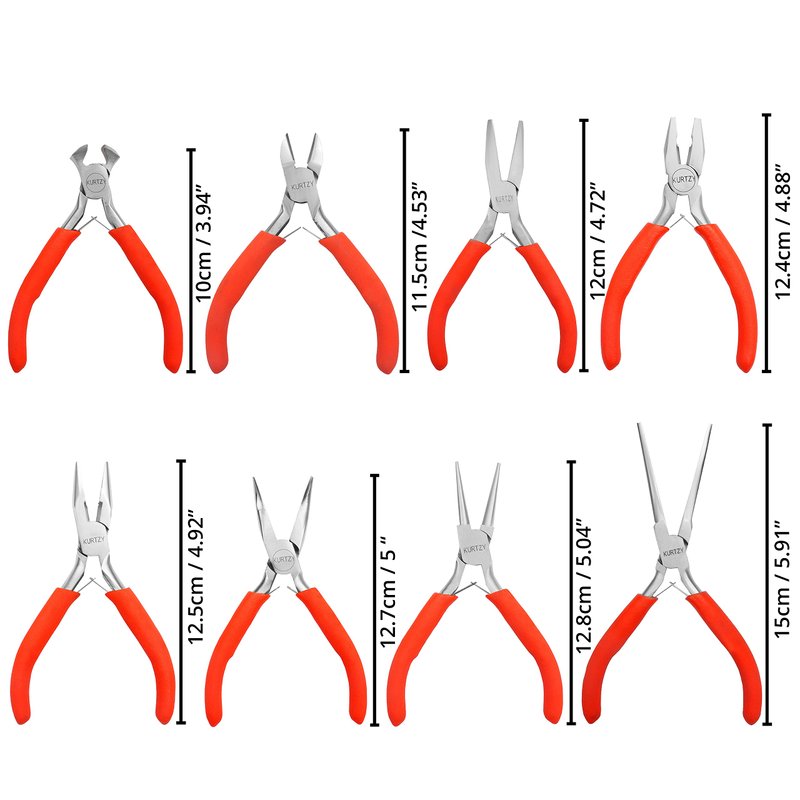 - 8 PIECE PLIER SET: This kit contains ideal tools for beginners or professionals. With spring-loaded and rubber non-slip handles, they require less effort and are easy to use. Our set contains wire cutters L11.5cm (4.53 inches), long nose pliers L12.5cm (4.92 inches), round nose pliers L12.8cm (5.04 inches), needle nose pliers L15cm (5.91 inches), flat nose pliers L12cm (4.72 inches), bent nose pliers L12.7cm (5 inches), linesman pliers L12.4cm (4.88 inches) and end cutters L10cm (3.94 inches).