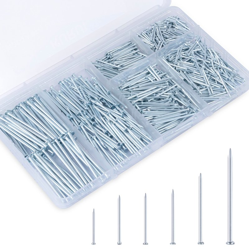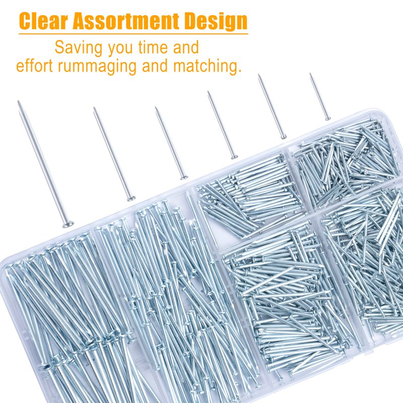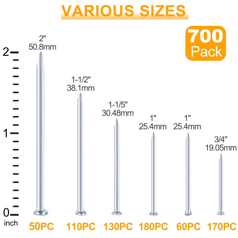 - WHAT YOU GET - You will receive 60 pcs of 1" Finishing Nails, 170 pcs of 3/4" Flat Head Nails, 180 pcs of 1" Flat Head Nails, 130 pcs of 1.2" Flat Head Nails, 110 pcs of 1-1/2" Flat Head Nails, and 50 pcs of 2" Flat Head Nails in a well-made transparent box.