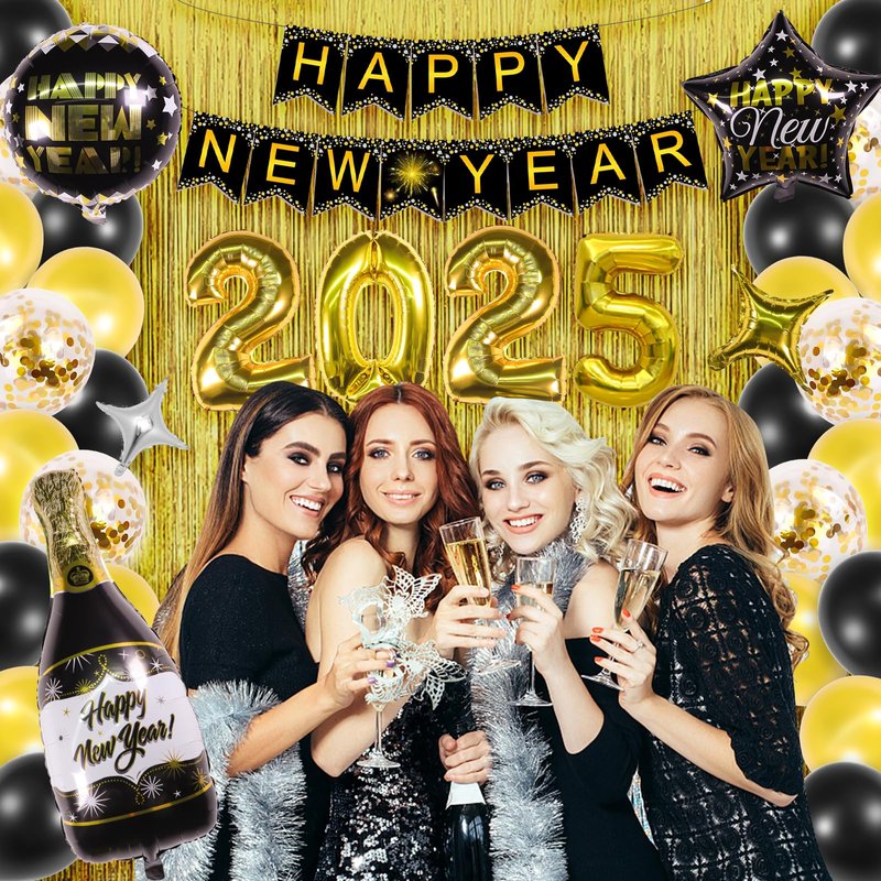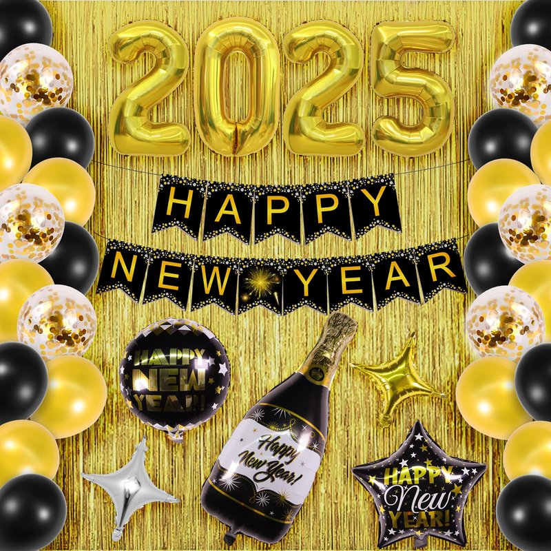 - Value Package: 2025 New Year's Eve party supplies set has everything you need. new years decorations kit includes 1 Happy New Year banner, 2 gold shimmer wall backdrop, 16 gold balloons 12 inch, 14 black baloons, 7 gold confetti balloons, 1 champagne foil balloon, 1 five-pointed star foil balloon, 1 round foil balloon, and 1 gold and 1 silver four-pointed star foil balloon. Kusamue 2025 decoration set contains all the essential items to create an amazing New Year's Eve party