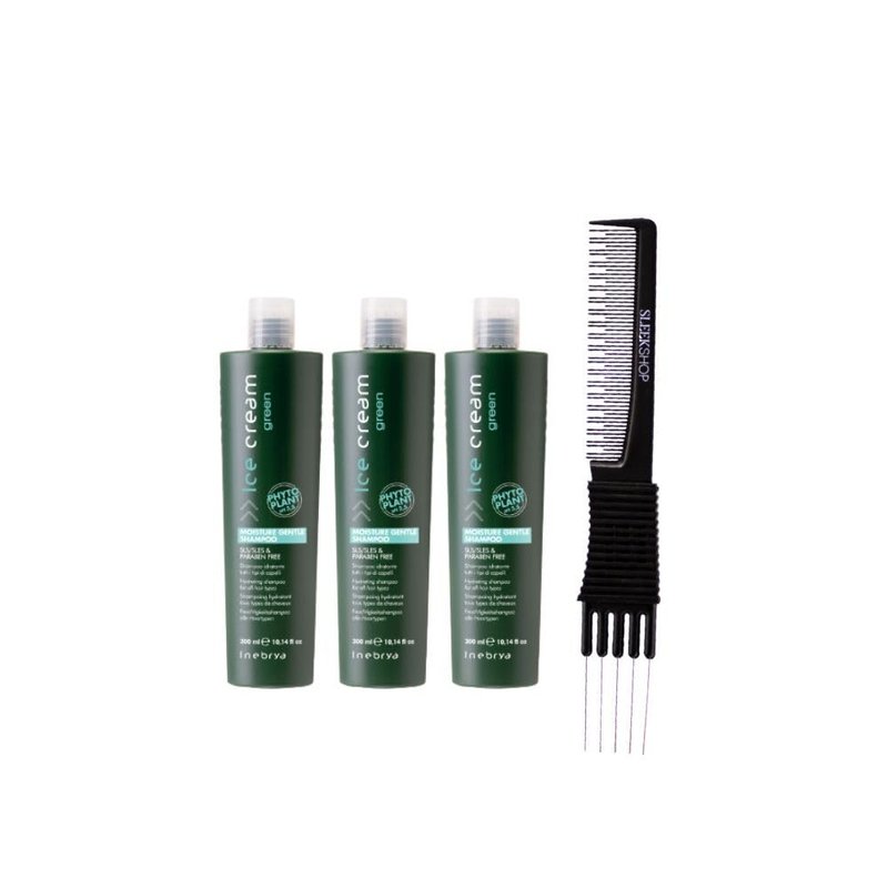 kuss Inebrya Ice Cream Green Moisture Gentle Shampoo (10.14 oz) with Teasing Comb Pack of 3