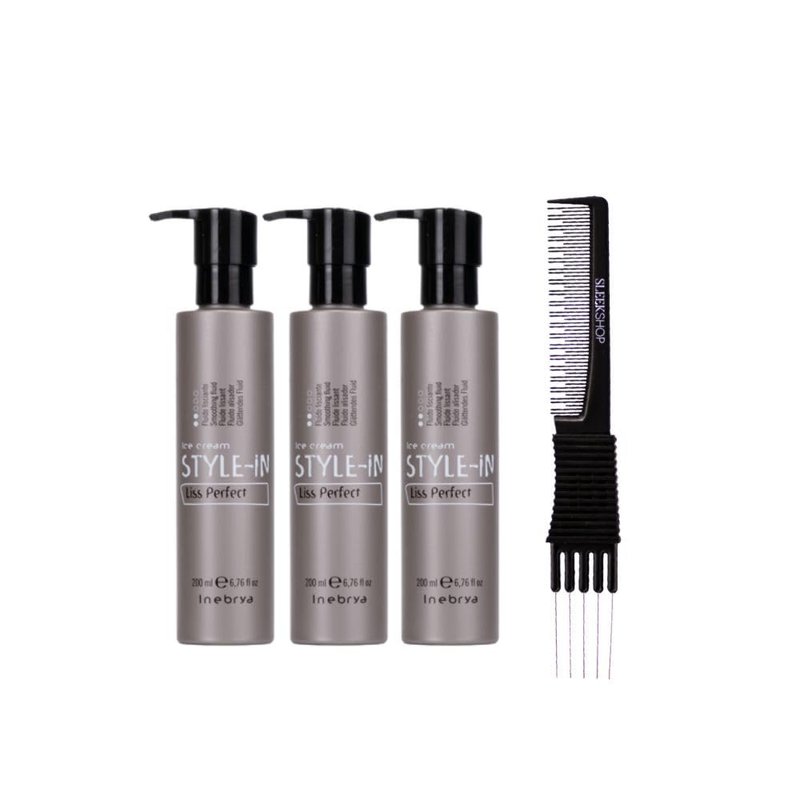 kuss Inebrya Ice Cream Style-In Liss Perfect Smoothing Fluid (6.76 oz) with Teasing Comb Pack of 3