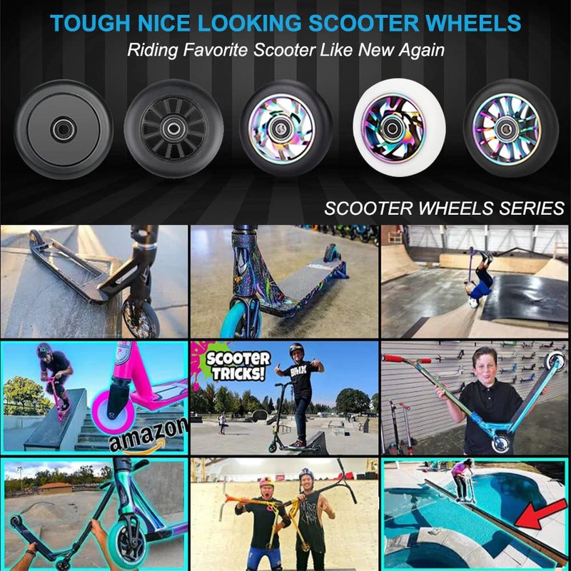 I won't mention the name, but my son bought a very expensive pair scooter wheels, and they broke after 3 days. and I didn't want my son to miss out on scootering with friends, so I took a chance and ordered these to use. My son loved them and when his new wheels showed up, one of his friends was quick to barter these from him. They look great, and are so quiet (a feature that I have noticed as a spectator really seems to be a mark of a higher quality wheel), and they are holding up great at the skate park.
