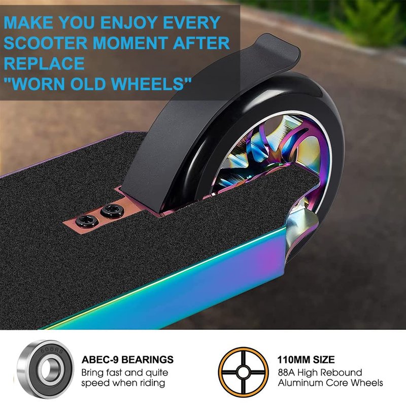 - [GREAT 110MM SCOOTER WHEELS]These scooter wheels are the Top 110mm scooter wheel you can found! Ultra-durable and friendly service if you buy our scooter wheels - Make the old scooter release a new scooter life when you have replace the old worn + stuck wheels.