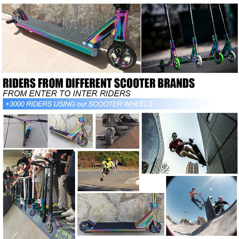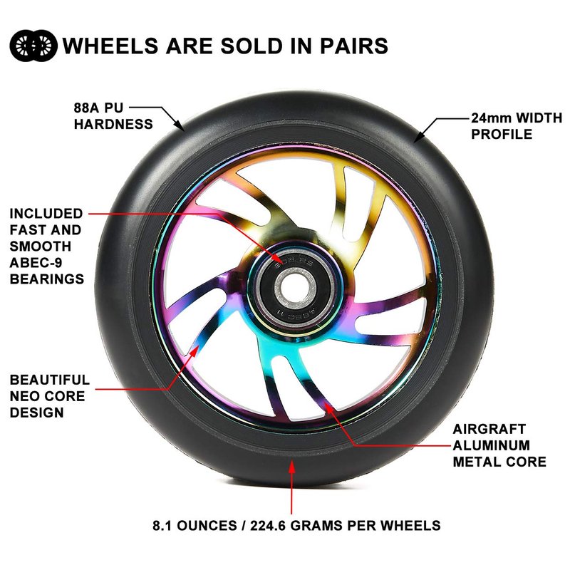 - [DO MORE SCOOTER SKILLS ]High performance quality for the 110mm scooter wheels,Pu adopt quality material - tested by teens riders - PU never worn easily and pu de-hubs.Great for kids and teens riding in street and skatepark.(The Wheel's Neo Core Design will make the scooter be more cool.)