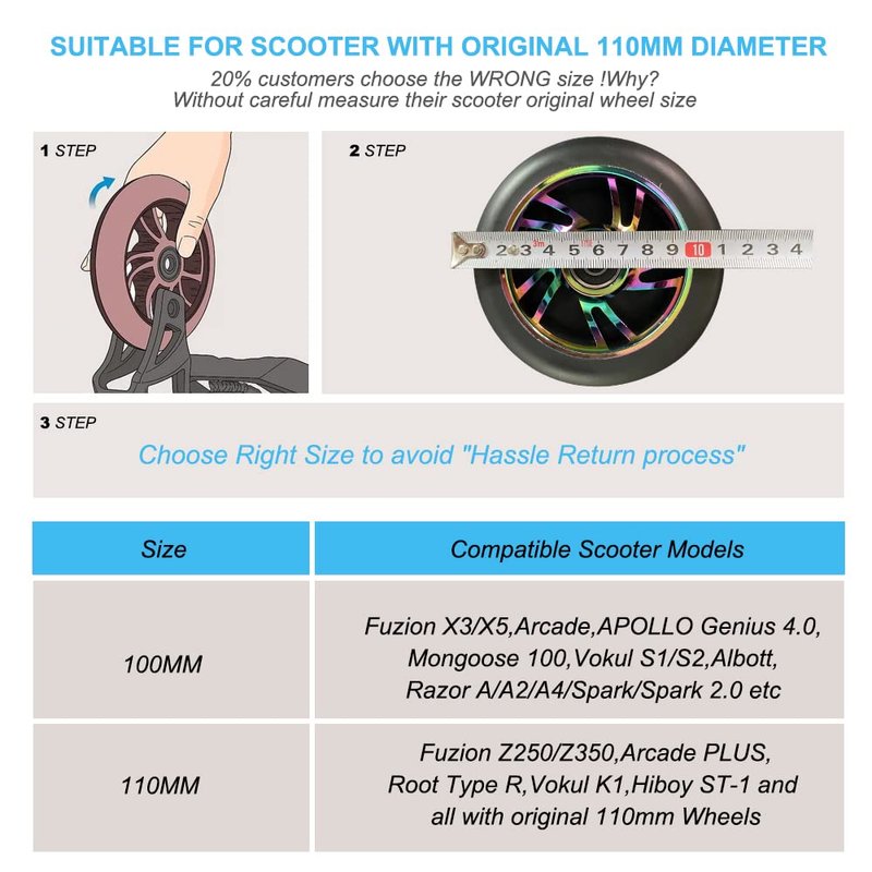 - [MUILT SCOOTERS BRANDS]This 110mm scooter wheels replacement compatible with pro or kick scooters with original 110mm wheels like fuzion X-5, Z250/Z300,MGP VX8,vokul K1,Lucky TFOX etc - Measure RIGHT size firstly!!(30% Buyers suffer a return hassle if choose Wrong Size)