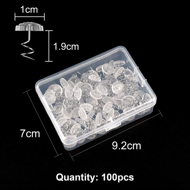 Specifications: Color: Clear Material: Plastic heads, nickel plated steel pin Product weight: Approx 55g Quantity: 100 pieces with plastic storage box Wide usage: - Keep slipcovers and arm covers in place - Hold bedskirts and mattress pads - Attach sheets and blankets to the mattress - Hold sagging car headliners in place - Hang photos and art. Notice: The pin is sharp parts, please pay attention to safety; keep away from kids