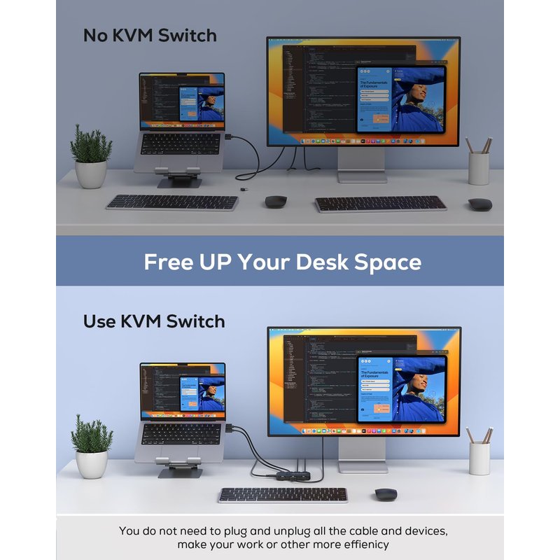 - 【Great Compatibility & One Button Switch】This kvm switch works with great compatibility, driver-free for Windows 10/8/8.1/7/Vista/XP and Mac OS, Linux, and Chrome OS, simply plug and play,No external power required. Easily switch between 2 displays by a single click on the button.