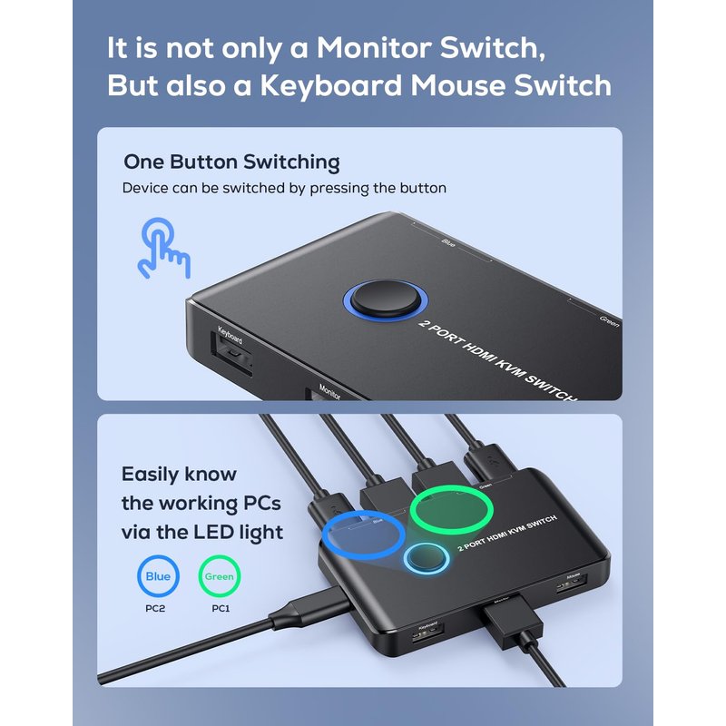 - 【USB KVM HDMI Switch】This HDMI KVM Switch allows you to control 2 computer with only one set of controls(Monitor,Mouse,Keyboard and Printer).You can easily switch between two displays.Makes your work and life much more simple and efficient.LED light color(Green or Blue) indicating the active computer.