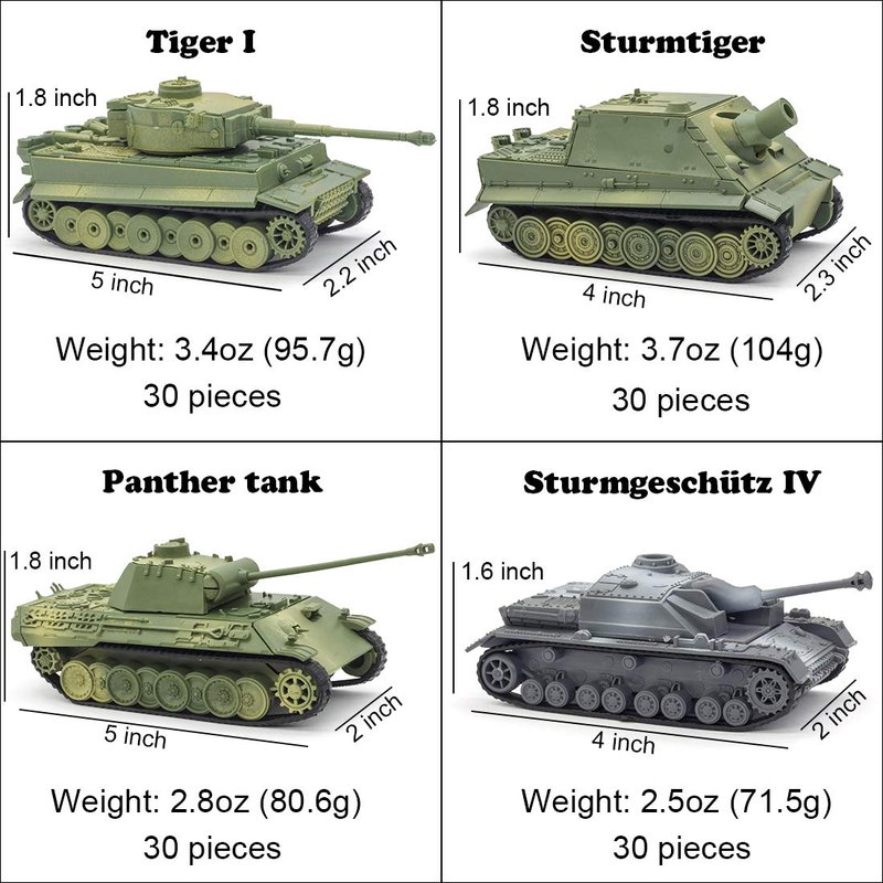 - INCLUDING: Sturmtiger, Tiger I, Sturmgesch¨¹tz IV, Panther tank (Each tank is random color in green and gray). Total in 4 Set. 30 parts for each model tank. They are German-made tanks in the Second World War.