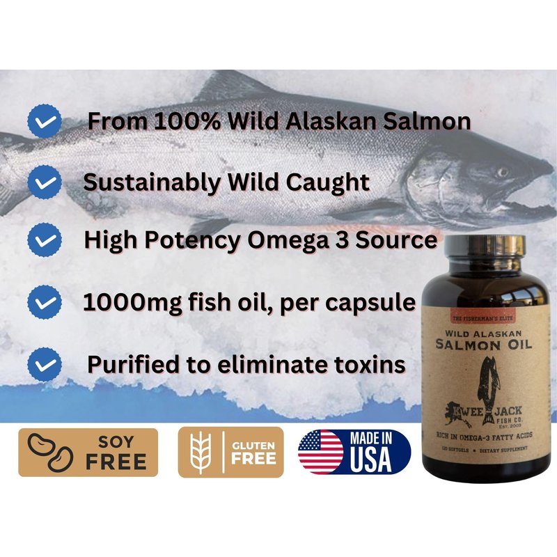 Kwee-Jack Fish Co. Wild Alaskan Salmon Fish Oil Omega 3 Supplement 120 Softgels 1000mg Salmon Oil Per Capsule | Anti-Inflammation, Brain, Heart, Joint Health | EPA, DHA, Vitamin D, Astaxanthin