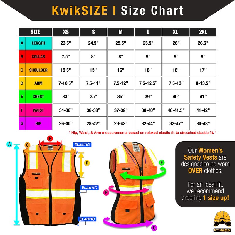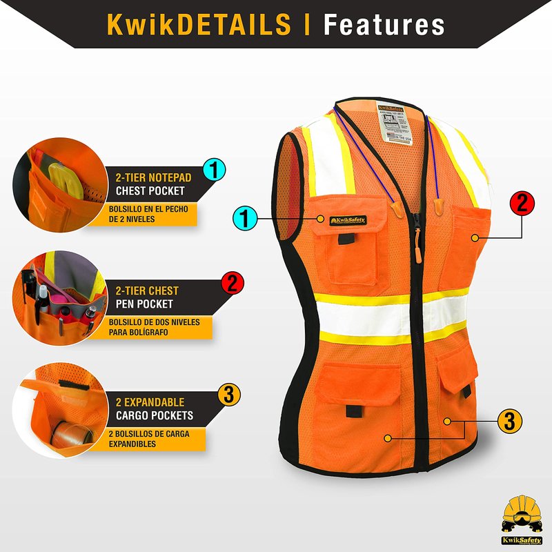 Get "The Safety You Need, The Style You Want" w/ KwikSafety’s wide variety of ANSI tested & OSHA compliant safety vests reflective with pockets and zipper. These unique one-of-a-kind & fashionable reflective vests deliver a more modern & professional look while providing the highest standards of safety w/ greater 360 visibility. Reflector vest crafted w/ breathable polyester reflective safety vest fabric best reflective safety vest. Equipped w/ functional & accessible pockets to hold anything from your ID/pens/keys/tools! Customize your KwikSafety custom safety vest / safty vest w/ logo prints & even embroidery! This saftey vest / saftey vests / comstruction vest will ensure that you are easily noticed & identifiable on the worksite while also looking sharp & professional in industry leading safety & comfort. KwikSafety's orange safety vest & yellow safety vest (not pink safety vest) unique designs make these high visibility vest / aafety vest perfect for both indoor & outdoor use. Ideal reflective vest w/ pockets for use at construction sites / construction safety vest, highway road work vest with pockets, crossing guard, security, foreman, roofing, utilities, survey/surveyor safety vest, manufacturing & by emergency responders as well as casual wear where safety is required. Safety vests reflective Features: ANSI/ISEA 107-2015 Class 2 Type R standards where safety is the highest priority or where visibility is heavily compromised. Hi visibility fluorescent yellow & orange / red safety vest ( not purple safety vest or hot pink safety vest for women ) reflective material, effective both during day & night time hours. Quality, flexible 2-inch tested silver classic solid design hi vis vest / standard safety vest reflective tape. Moisture-wicking 100% Polyester safety vests reflective / saftey vests with pockets. Functional & durable versatile work vest for women with pockets. Women safety vest with pockets high visibility women. Machine washable constrution vest.