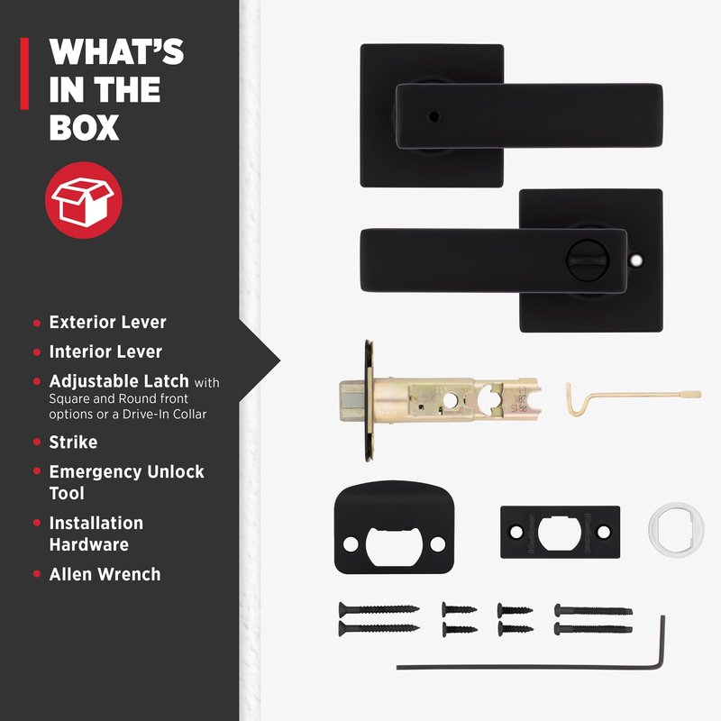 - BOX INCLUDES: Privacy lever, adjustable latch with round and square front options or drive-in collar, round corner strike, rosette, screws and Allen wrench