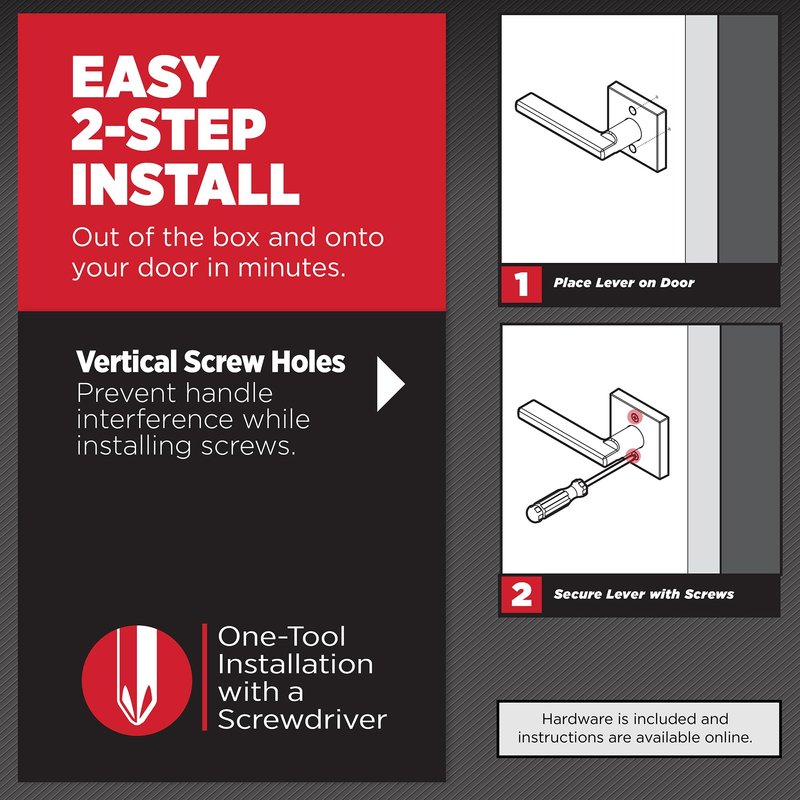 - BOX INCLUDES: Door Lever, Mounting Screws, Install Guide