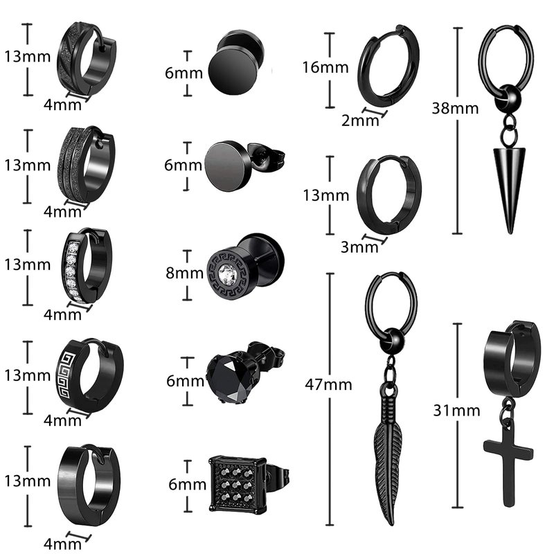 - 【Set of Men's Earrings】: This set includes a selection of 15 pairs of earrings designed for men. Featuring 5 pairs of black stud earrings, 3 pairs of dangle hoop earrings, and 7 pairs of small, circular hoops, These black earrings fro men offers a range of options for versatile and stylish wear.