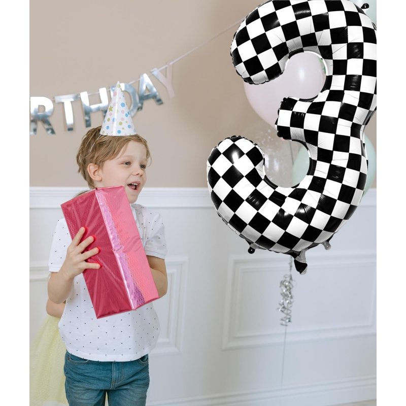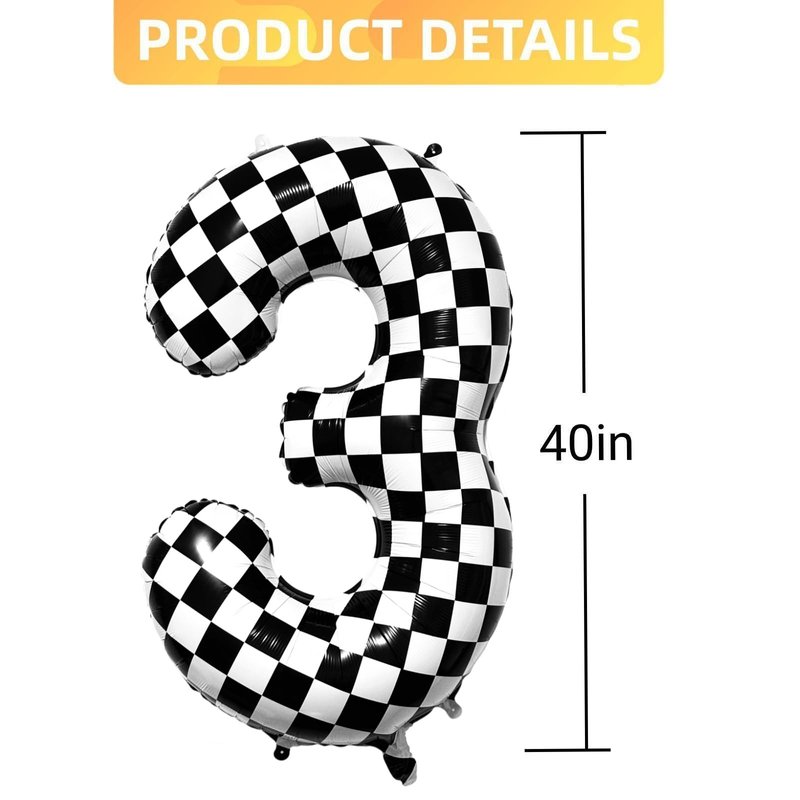 - CHECKERED NUMBER 3 BALLOON: 40 inches big size, in classic black and white colors, full of emo racing elements, vintage and cool, perfect for boys 3rd birthday decor.