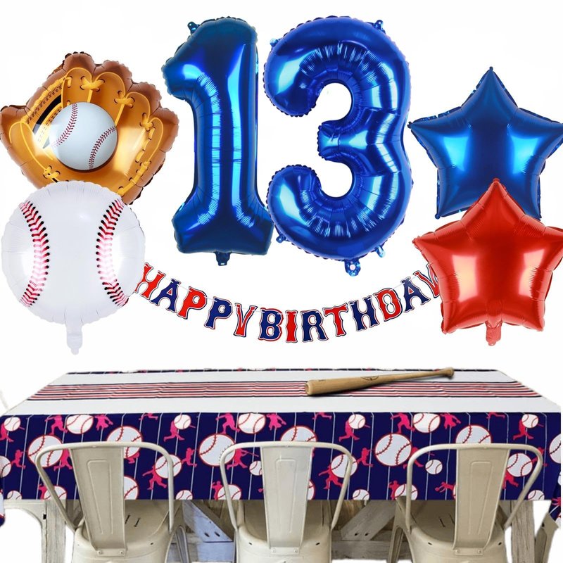 - BASE BALL THEME DESIGN | SPORTS BIRTHDAY DECORATIONS: Featured navy blue red white colors, with the big number 13 balloon, great combination of sports and birthday, fantastic baseball birthday party supplies for 13 years old boys, help teen boys step in a happy, passionate and dynamic sports atmosphere.