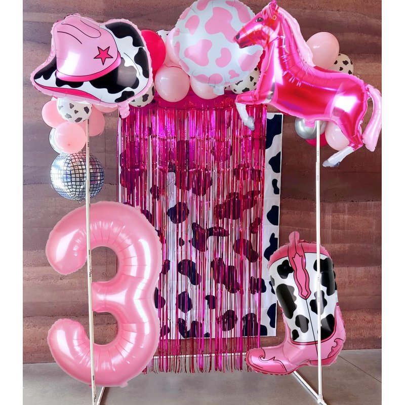 - WESTERN PARTY BALLOONS| 5 PCS PACK: 1 x 32" pink number 3 balloon, 1 x 29" pink horse balloon, 1 x 20" cowgirl hat balloon, 1 x 22* cowgirl boot balloon, 1 x 18" cow print balloon, 1 x 32ft ribbon, 1 x straw.