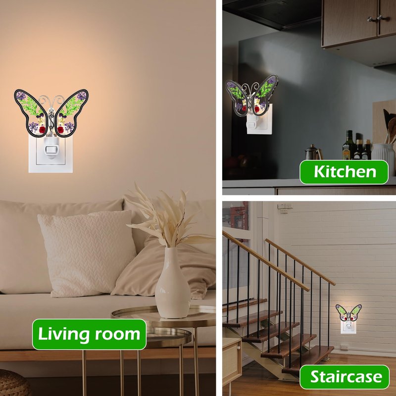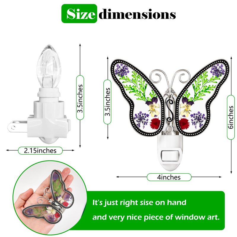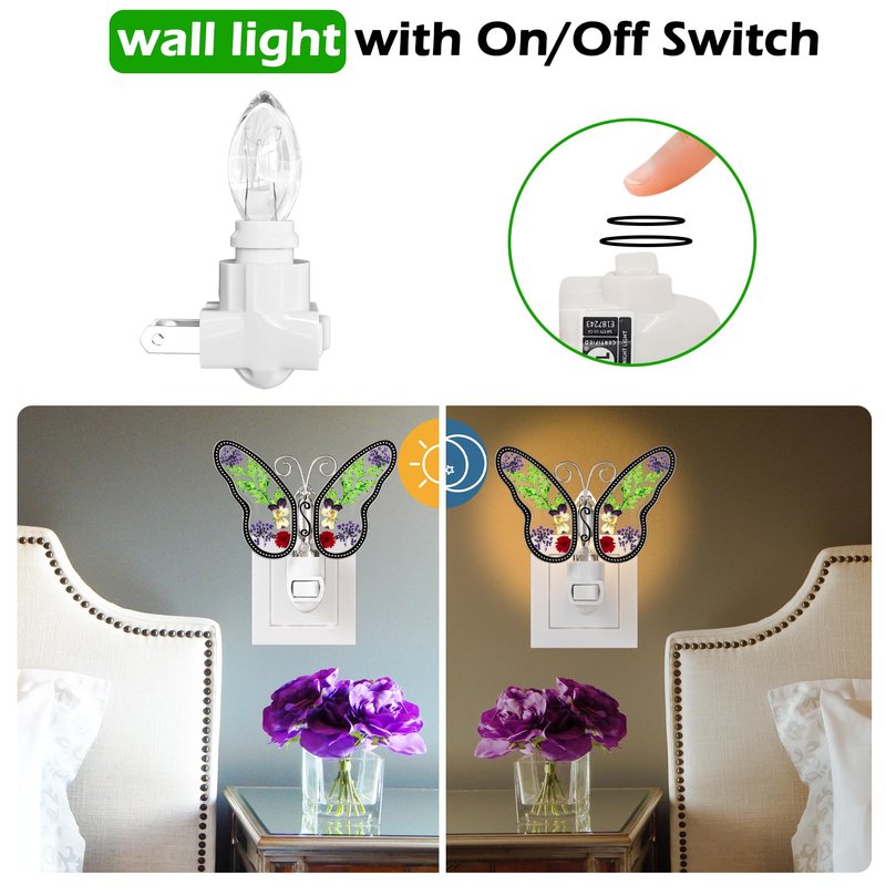- This decorative Butterfly night light features rich shades of amber:Real Flower Yellow and Purple and Green and red,Use in any standard 3 prong wall outlet. standard medium base (E12) Socket and 4 watt bulb included, no sharp parts, don’t get hot. By the way, you can use LED lamp, So say good bye to being alone in the dark;