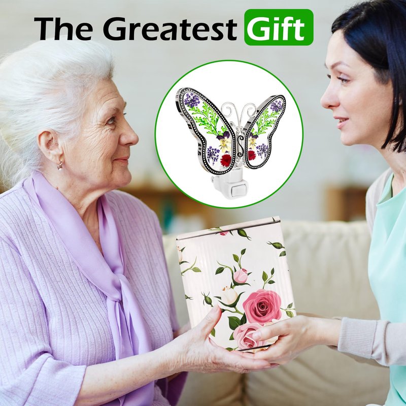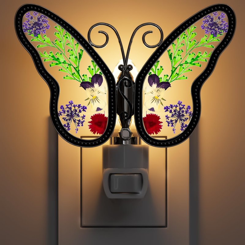 KY&BOSAM Butterfly Night Light Plug into Wall, Real Flower and Glass with Metal Trim Nightlights for Hallway, Nursery Bedroom Bathroom Kids Room, Kitchen, Stairway, Accent Elegant Home Decoration