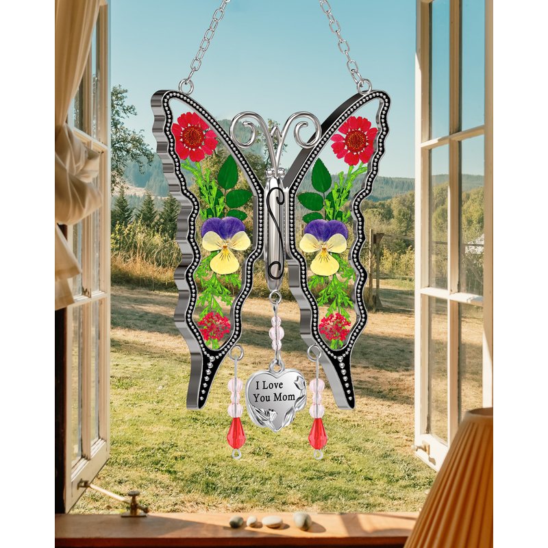 KY&BOSAM Gifts for Mom Suncatcher Butterfly Mom Gifts Mothers Day I Love You Mom Stained Glass Sun Catcher Hanging Wind Chime Ornament for Window Gift for Mother`s Day Valentine`s Birthday Christmas