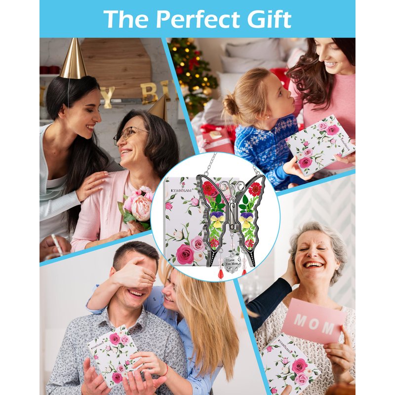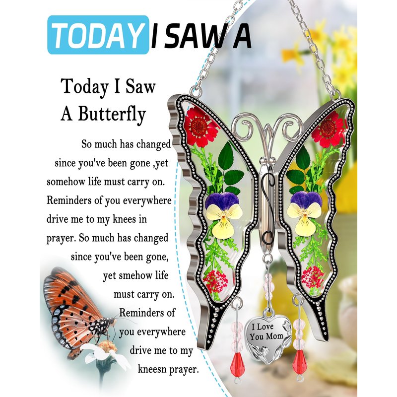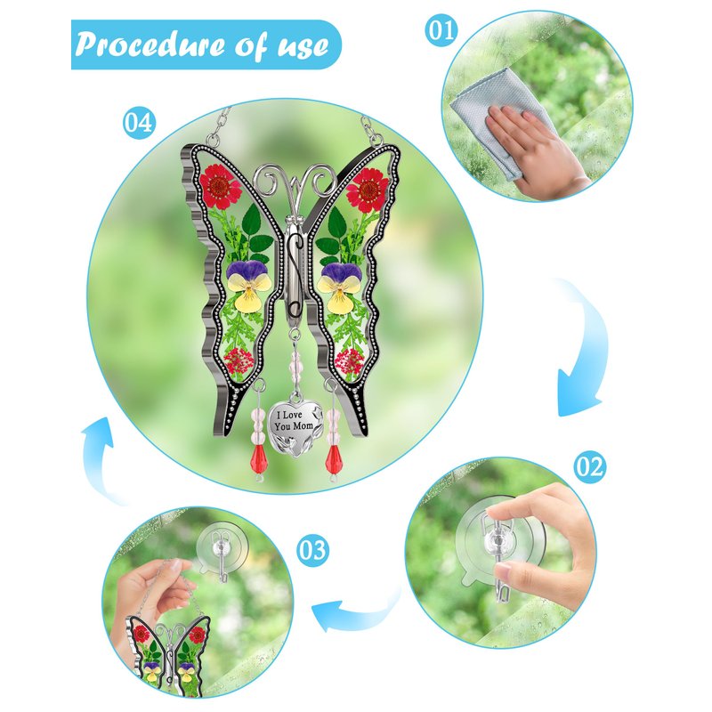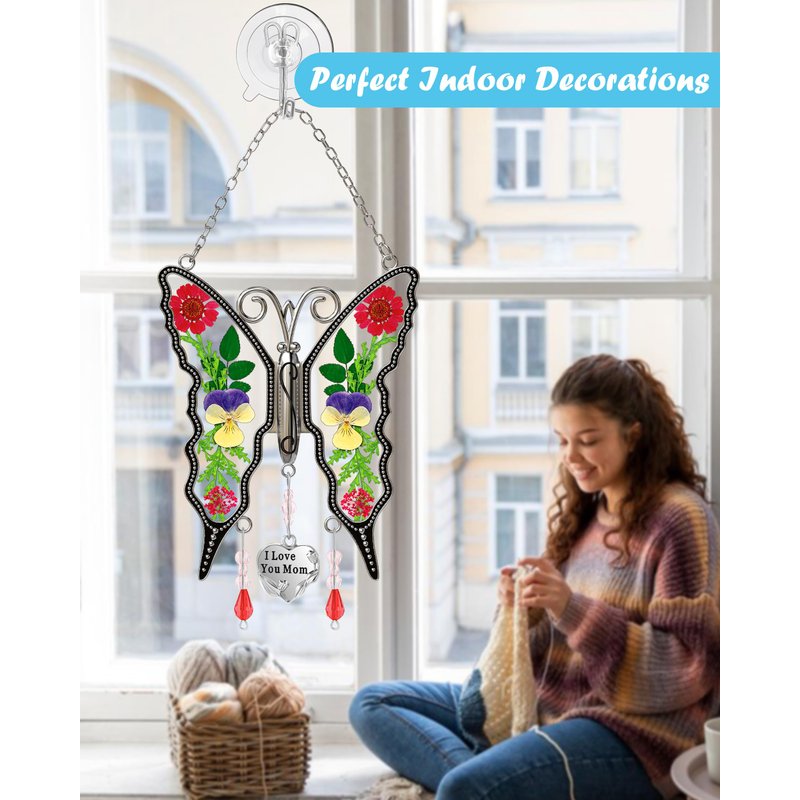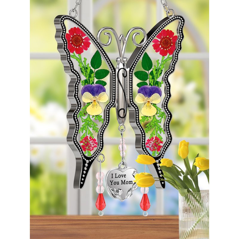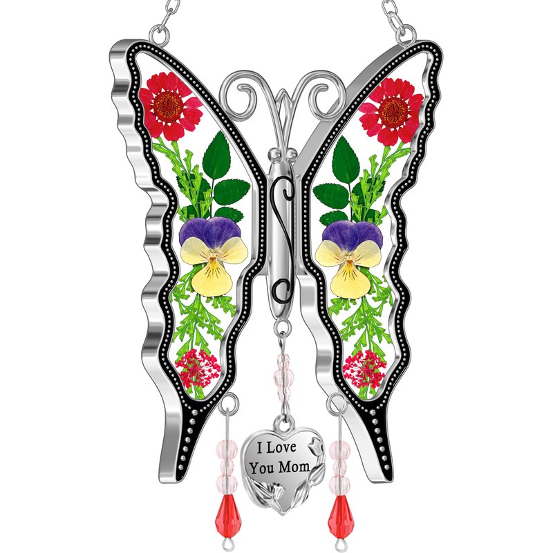 - ❤Detail: The gifts for women Butterfly suncatcher home decor is made of electroplated silver & zinc alloy, Glass, Real flower material, which is firm and textured, real flowers pressed between of wings Embedded in Glass, the dried pressed flowers are adopted from nature, so that would be slightly different for each one, three lavender pendants on the bottom, one of the pendants has a heart-shaped tag hanging on it, which is engraved with "I Love You Mom", it's a nice gift to express your love to your Mom;