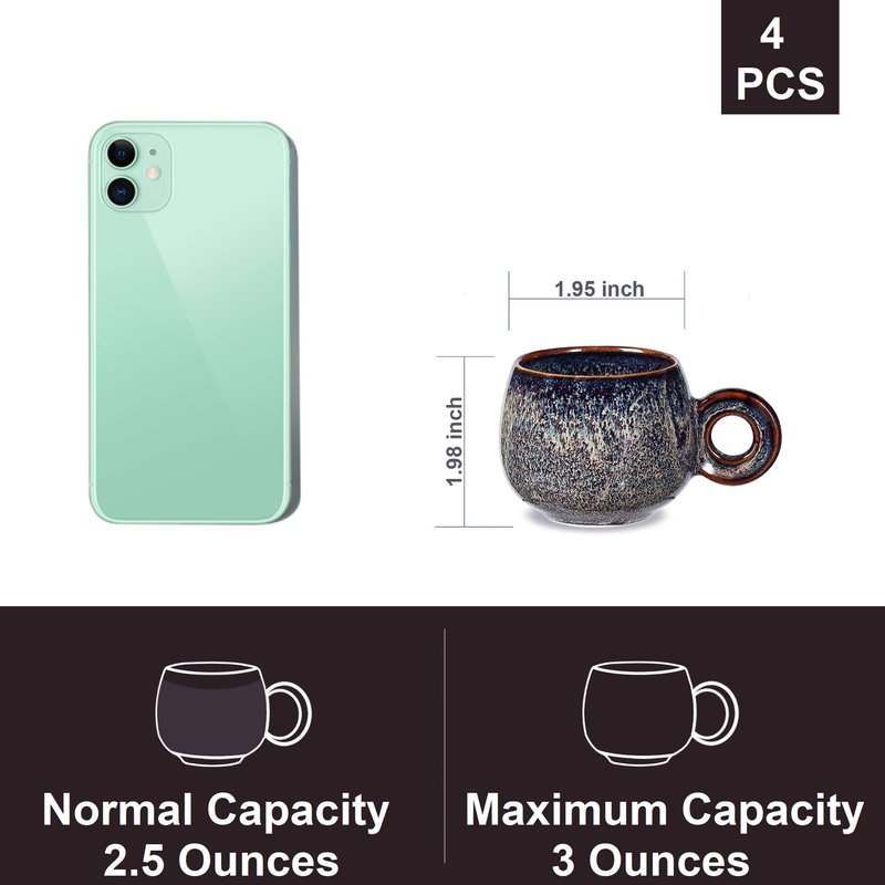 - WHAT’S IN THE PARCEL? It includes Four(4) pieces ceramic mini espresso cups. With a maximum capacity of 3 oz, these small cups could hold like espresso, baby cappuccino, tea and so on.