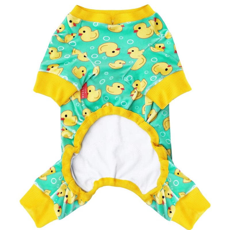 - Dog pajamas in yellow duck printing, is made of soft stretchable velvet, very comfy for your dog's dailywear. Pullover design dog pjs, easy to put on and off.