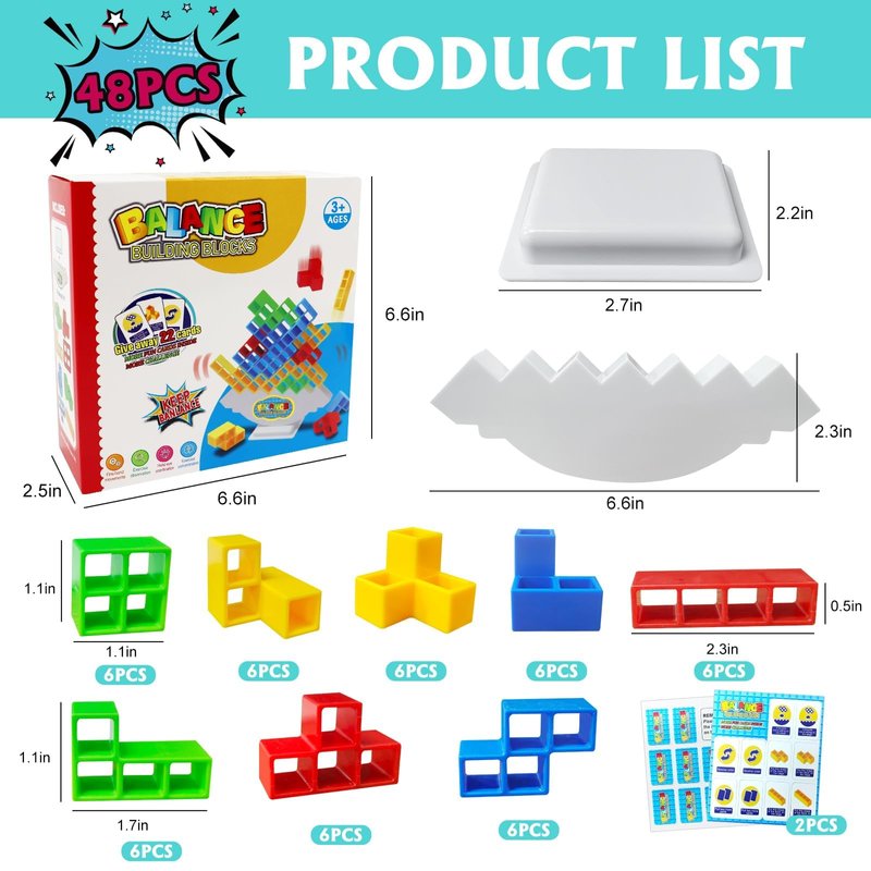 - 🧩 Stacking Game Toys: This kids balance stacking toy is made of 100% ABS, and the swing stack balance toy sets has 16 balance blocks (4 different colours & shapes),1 balance base,1 base. Balanced building block game toy set size is 6.6*6.6 in, and comes with colored packaging. The instruction manual for building block games makes it easy for both kids & adults to play with stacking toys.This is a balance education toy and puzzle game that children play with their parents, a perfect family game! It's also a New Year's gift.
