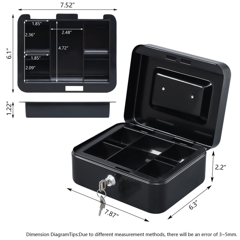 KYODOLED Medium Cash Box with Money Tray,Small Safe with Key,7.87"x 6.30"x 3.54" Black