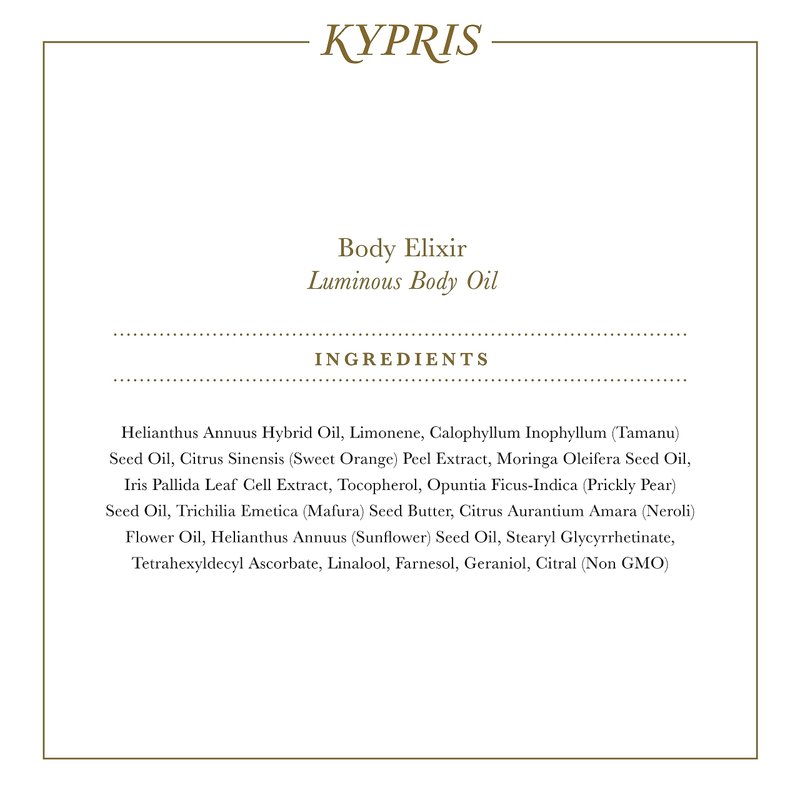 KYPRIS Body Elixir: Inflorescence is a non-greasy, multi-functional body oil designed with a potency typically reserved for facial care and 12 of the most nurturing organic, wild crafted, and co-op grown botanicals blended with the aromatherapy of Neroli and Sweet Orange