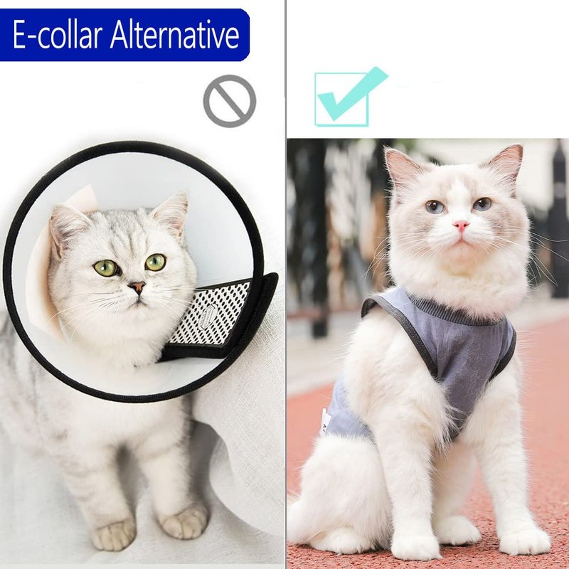 - Our cat recovery suit is the alternative of E-collar and cone. It is easier to use than E-collar and cone and can reduce the pain after surgery.