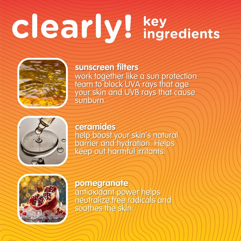 The Ceramides in clearly! help boost your skin’s natural barrier and hydration, in addition to keeping out harmful irritants. clearly! also contains pomegranate which is an antioxidant that helps neutralize free radicals and soothes the skin.
