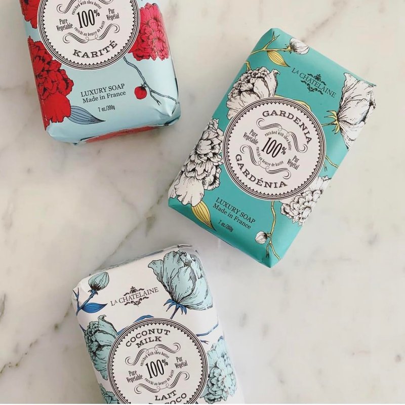 La Chatelaine vegetable based soaps are made in Provence using time-honored craftsmanship and ethically sourced natural and organic ingredients. Enriched with Organic Shea Butter, Organic Argan Oil, Organic Calendula, and Vitamin E to leave your skin feeling cleansed, soft, and moisturized. Milled four times resulting in a dense, long lasting bar with a luxurious lather. Our exquisite scents are phthalate-free and created by distinguished perfumers in Grasse, France. Cruelty-free and formulated without BHT, Parabens, Phthalates, Colorants, Gluten, Soy, or GMO's. Made with RSPO Certified Sustainable Palm Oil. With their elegant botanical designs, these hand-wrapped soaps make a perfect gift!