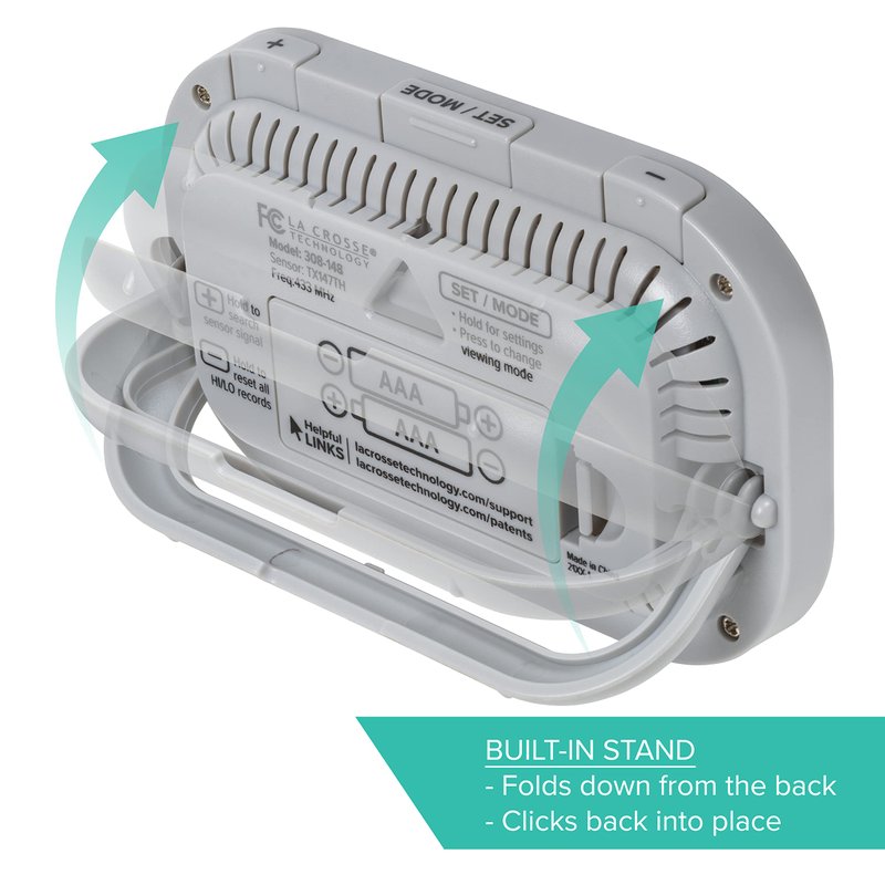 - Displays indoor and outdoor temperature (°F/°C) & humidity (%RH) with HI/LO records and time with date stamp