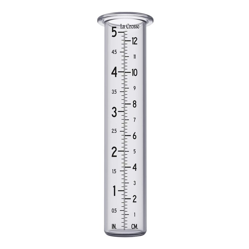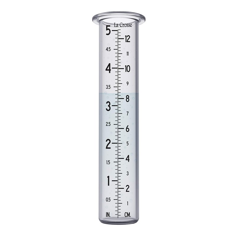 - Measures up to 5 inches of rainfall. NOTE: Place the rain gauge in an open area to measure rainfall for your lawn and garden. For accurate measurements, do not place near water runoff from roof lines or any other structures. Or it will read incorrectly