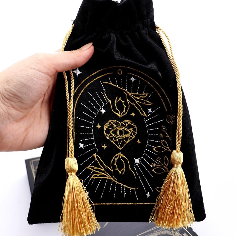 Crafted from plush purple velvet and adorned with enchanting black and gold embroidery, our tarot bags are designed to keep your precious decks protected in style. Finished with adorable gold tassels, these bags offer versatility beyond compare. Use them to safeguard your tarot cards or explore your creative whims. Additionally, these bags can be repurposed for storing jewelry, crystals, or other small treasures. Elevate your tarot experience with our exquisite tarot bags, perfect for multiple purposes.