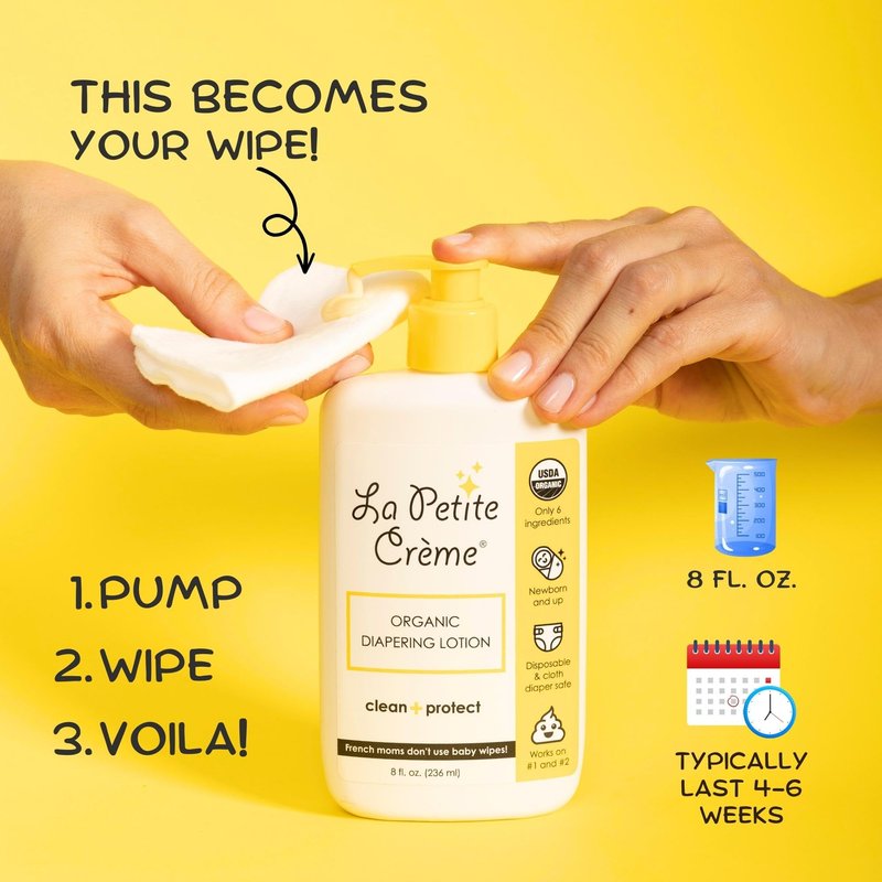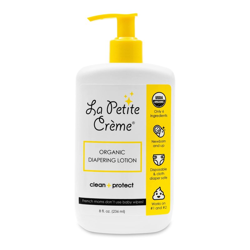 Easy, Effective, and Eco-Friendly Diapering Lotion Alternative. Who says you can't dish out baby wipes? Ask the French moms! La Petite Creme Organic Diapering Lotion has a unique 3-in-1 function of cleansing, protection, and nourishment of your precious little ones sensitive tiny bottom. The best part? It's gentle but effective formulation is composed of only 6 natural ingredients - organic beeswax for healing, organic glycerine for moisturizing, Vitamin E for nourishing, organic olive oil for protecting, water for cleansing, and limestone for disinfecting. This soothing French baby lotion will help prevent diaper rash while also keeping your baby's skin soft and smooth. Moms who switched to this product love its simplicity and efficiency. Compared to average diaper rash spray, it's easy to use, you only need to apply it on a clean cotton pad then wipe the mess. Leave the excess on because that'll serve as protection for the baby's skin on his next pee or poop. It like having baby wipes, baby diaper rash cream, ointment, and soap and water in an all-in-one diapering care product! PRODUCT FEATURES: - 8 oz Organic Diapering Lotion - USDA Organic Certified - Single Diapering Care Solution - 6 Natural Ingredients - Paraben Free, Fragrance Free, Hypoallergenic Baby Lotion - Good for Cloth and Disposable Diaper Users - Handmade in the USA by French Moms