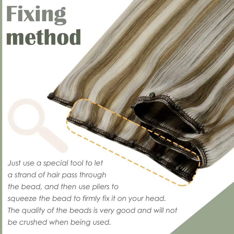 LaaVoo Micro Ring Beaded Human Hair Weft. The hair does not need any glue, weaving, clip or tape. The hair is very invisible as long as you wear it in the right way.
