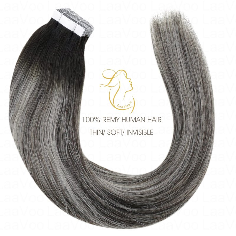 LaaVoo Black Tape in Hair Extensions Human Hair Ombre 22 inch Off Black to Silver with Black Balayage Tape in Human Hair Extensions for Black Women Long Skin Weft 20pcs 50g
