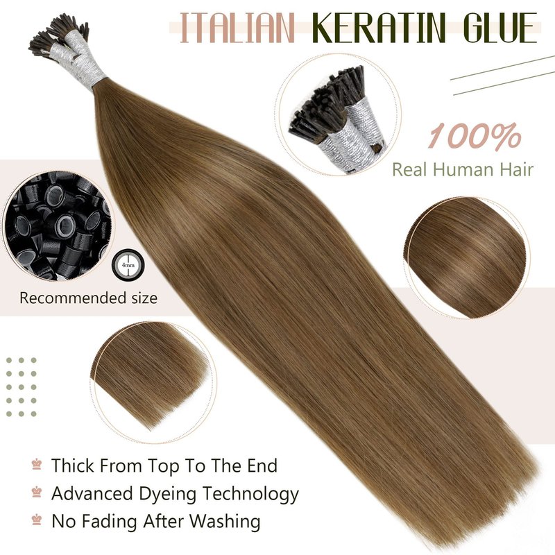 LaaVoo Brown I Tip Hair Extensions Ombre Medium Brown with Light Brown to Golden Brown Hair Extensions Itips Human Hair 16" 50g 50s