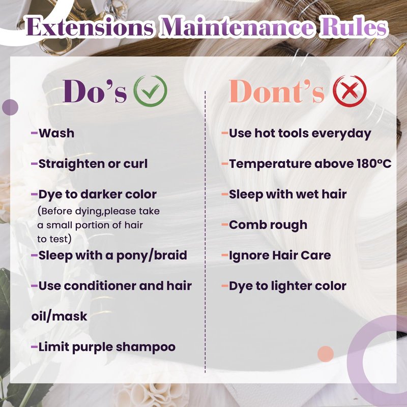 - [Maintenance and Care] To ensure the longevity and durability of your hair extensions, proper maintenance is vital. Avoid excessive heat styling, use gentle products(staining occurs when using purple shampoo), and store them with hair extensions storage bags when not in use. Please do not bleach your LaaVoo human hair extensions. Because LaaVoo hair extensions have undergone dyeing and other treatments, further bleaching or lighter dyeing will damage the hair quality and shorten its lifespan.