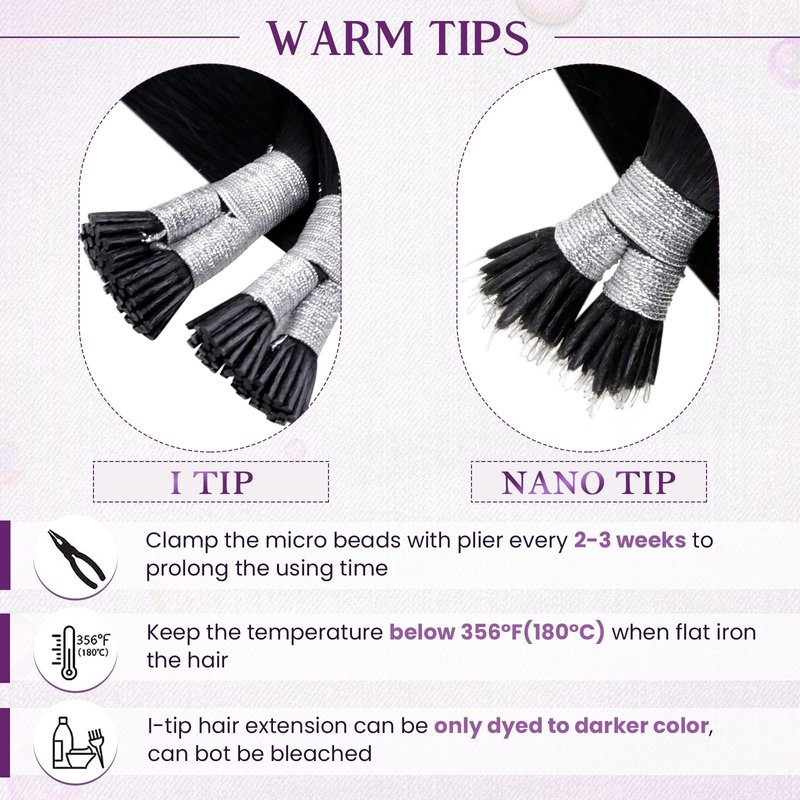 - Warm Tip: Installing 1.5 - 2 inches away from the scalp; Re-flattening the hair beads every 1-2 weeks and use a deep conditioner to do a deep conditioning hair mask once a week to prolong the use Itip Hair Extensions