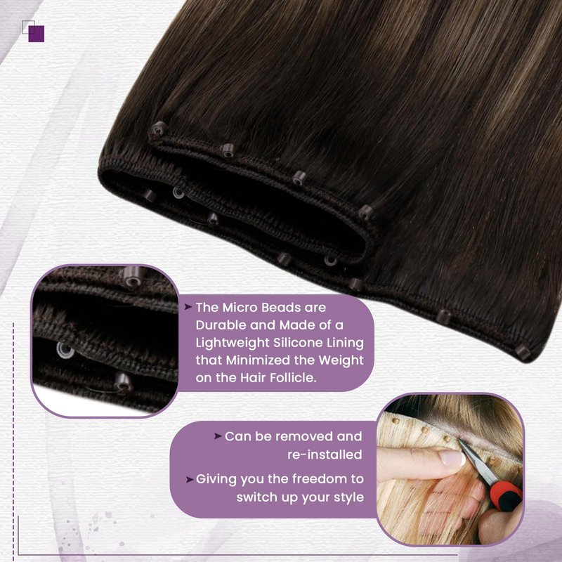 - 【Why Choose Beaded Weft Hair Extensions?】 Weft hair extensions with micro beads are wefts that are attached with tiny silicone-lined beads to your natural hair without the use of glue, heat, tape chemicals that are common culprits when it comes to hair damage.A little bit of your natural hair is pulled through the bead and then crimped to stay snug on your hair.They are reusable if properly cared for, and may stay with you for a very long time.