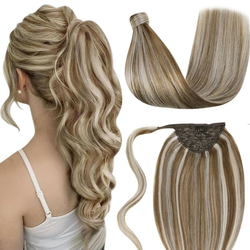 LaaVoo Ponytail Hair Extensions Human Hair Blonde Ponytail Extension Human Hair Wrap Around Brown Hair Extensions Ponytail Real Human Hair Ash Brown Highlight Light Blonde Short 12 Inch 70g