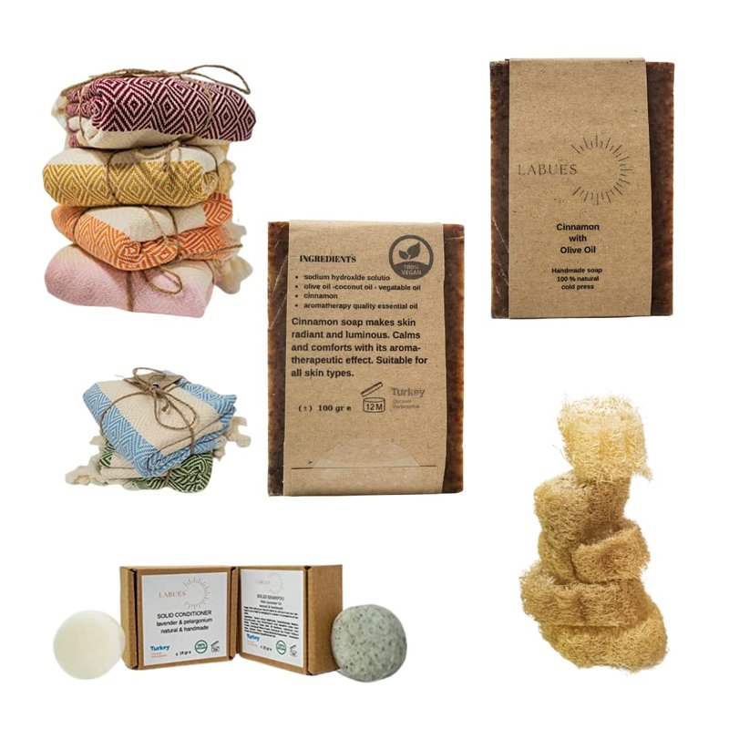 Eco-friendly travel set includes solid shampoo and conditioner bars made with natural ingredients, nourishing handcrafted soap, exfoliating loofah, and a versatile Turkish peshtemal towel made of premium cotton. Cleanses and nourishes hair and skin, removes dead skin cells, and promotes blood circulation. Highly absorbent and quick-drying, perfect for travel.