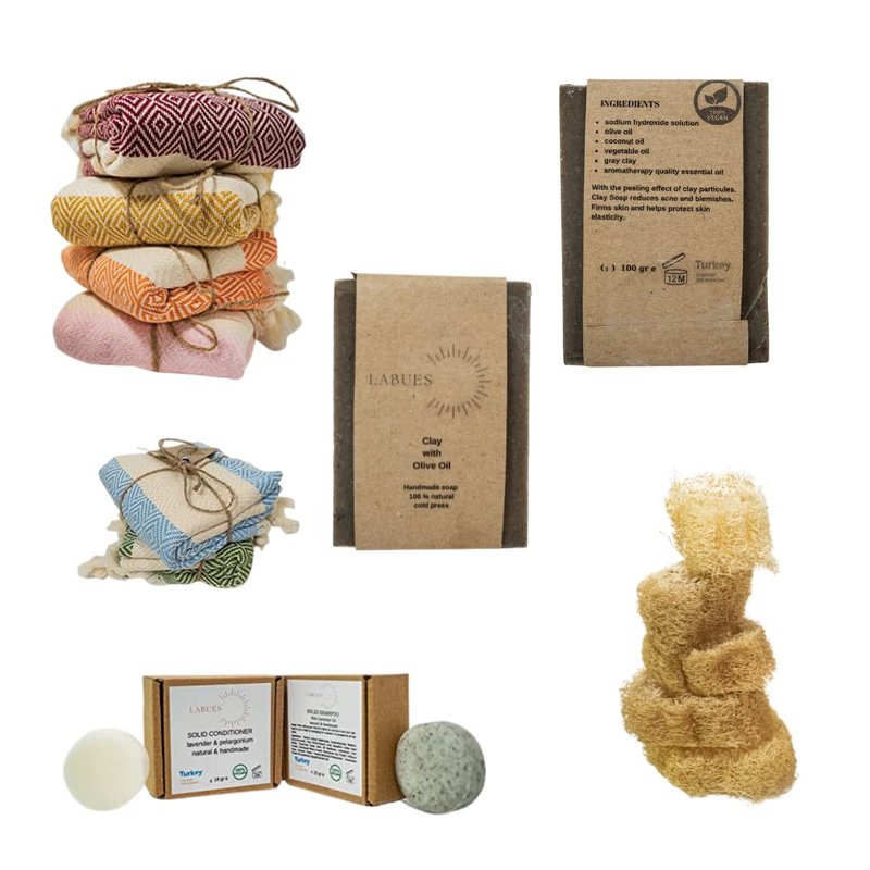 Eco-friendly travel set includes solid shampoo and conditioner bars made with natural ingredients, nourishing handcrafted soap, exfoliating loofah, and a versatile Turkish peshtemal towel made of premium cotton. Cleanses and nourishes hair and skin, removes dead skin cells, and promotes blood circulation. Highly absorbent and quick-drying, perfect for travel.