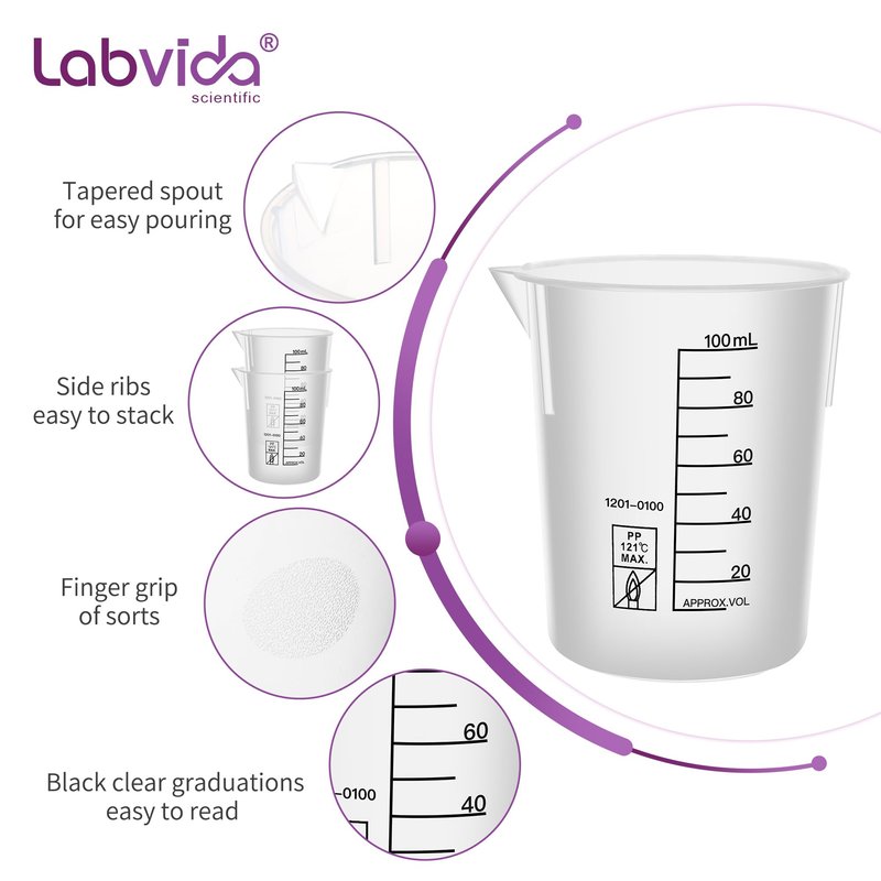 - 【Material】 Plastic beakers are made from food grade polypropylene plastic, non-toxic, smooth, Good chemical resistance, durable and autoclavable. Heat resistant with a melting point of 249.8 Fahrenheit or 121 Celsius;